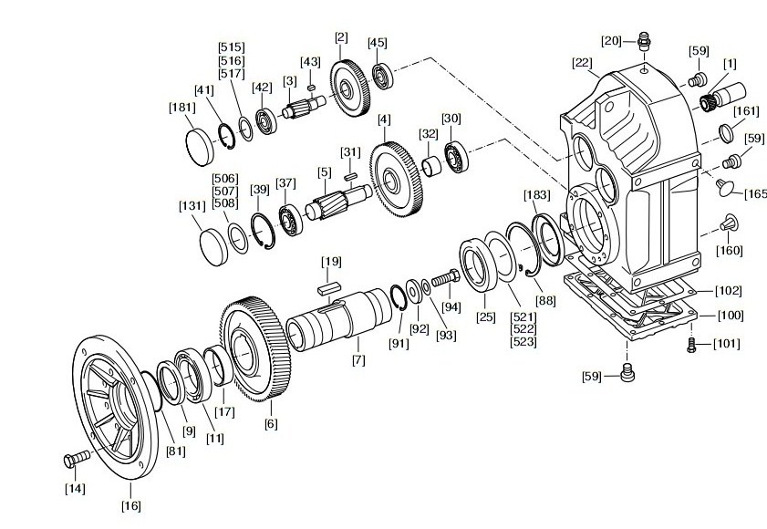 | 1 | Входная шестерня | 22 | Корпус редуктора | 91 | Стопорное кольцо | 506 | Регулировочное кольцо |