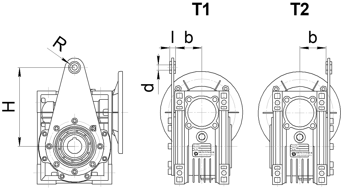 | Габарит | aw | L | B | H | A1 | A2 | A3 | d | S | B1 | H1 | H2 |